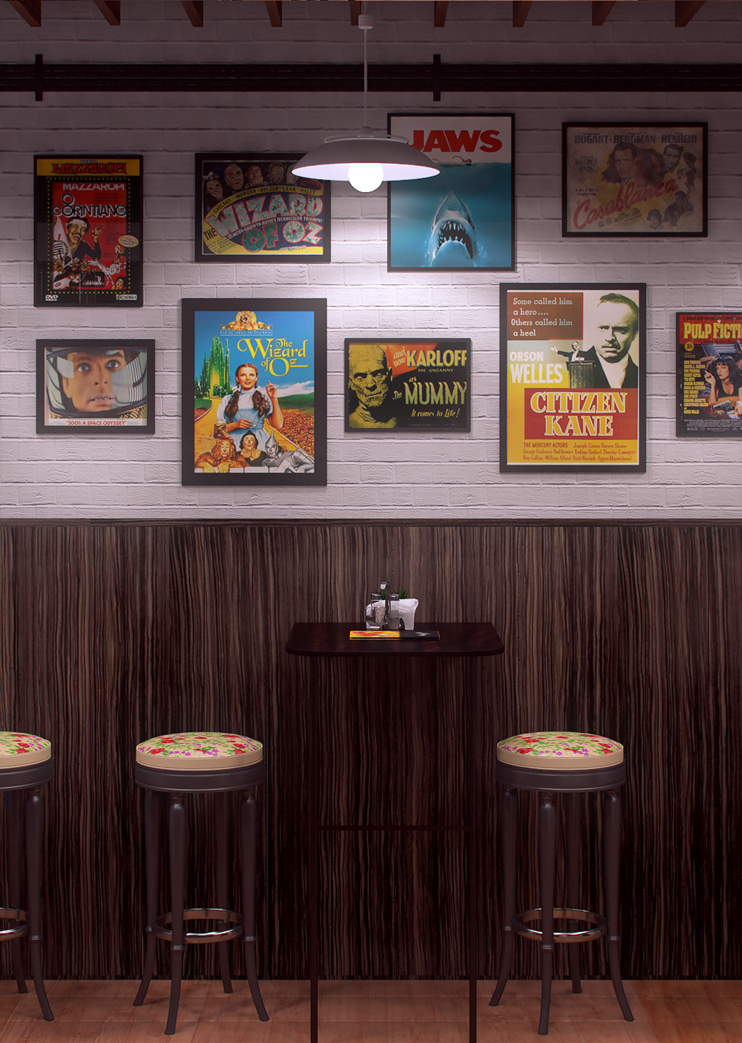 Ilustração 3D do espaço Lumiére, uma cafeteria que reverencia filmes clássicos, voltado para o público Hipster.